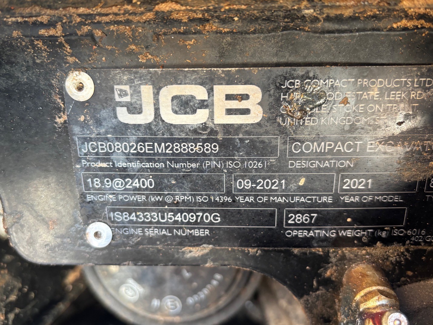 2021 JCB 8026, 2.8 Tonne Mini Digger, Hydraulic Hitch, 3 Buckets